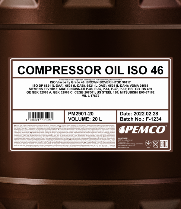 Use: This oil is mostly meant for air screw compressors with an oil injection system, operating on easy and moderate modes. It is suitable for air piston-type (easy, moderate operating modes) and air rotary (easy, moderate operating modes) compressors with the outlet air temperature up to 220°C where the oil with ISO VG 46 viscosity is required.