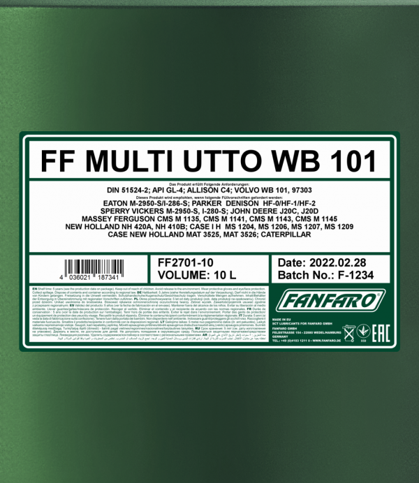 A universal and multi-functional mineral all-season tractor oil for farm holdings and tractors, agricultural vehicles with very high operating characteristics. Its main purpose: an oil for on-board gearboxes with a standard replacement interval. It complies with Volvo 97303 requirements. It is also suitable for mechanical gearboxes with and without synchronizers, transmissions (including power transmissions), back axles, hydraulic systems (including the ones integrated with a mechanical gearbox) and other equipment that requires Universal Tractor Transmission Oil (UTTO) grade oil. It is particularly suitable for the reduction of vibration in “wet” brake systems and power-take off.