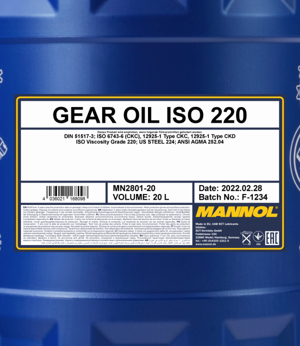 It is recommended for industrial closed gear wheels (reducers), lubricated by circulation or spraying (oil mist), especially when there are heavy loads and high temperatures, vibrations, high speed and sliding friction. It may be used for lubricating various mechanisms and separate parts that operate under heavy loads: all types of gear systems (including worm and screw), clutches and all types of bearings: roller, friction, etc., where the required level of operating properties is DIN 51517 Part 3 CLP and viscosity is ISO VG 220.