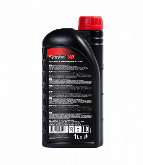 High-quality and highly effective multi-purpose synthetic hydraulic fluid with ashless additives, developed for central hydraulic systems of modern cars – Central Hydraulic Fluid (CHF). Designed based on the highest requirements of automakers for use over the entire life of the vehicle.